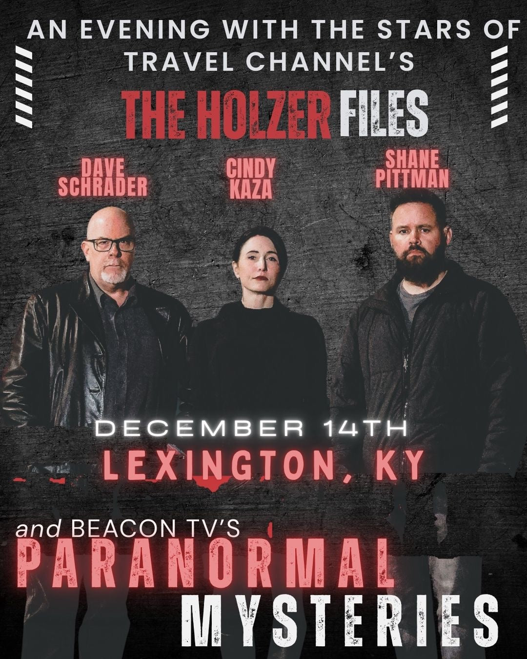 Join Dave Schrader, Cindy Kaza, and Shane Pittman for an unforgettable night of stories, evidence, and behind-the-scenes moments from The Holzer Files and Paranormal Mysteries. One night only! December 14th in Lexington, KY!